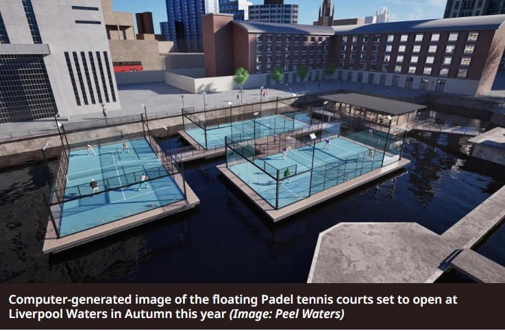 In the UK, Liverpool is taking a different tack. The computer-generated image above shows the country’s first floating padel courts approved at Liverpool Waters, built directly on dockside platforms.
